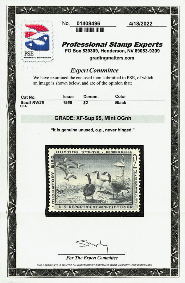 9340 nh RW25 imageFederal Duck Stamp, 1958, $2 Canada Geese (Scott RW25), o.g., never hinged, Extremely Fine to Superb, with 2022 P.S.E. certificate graded XF-SUP 95.