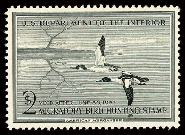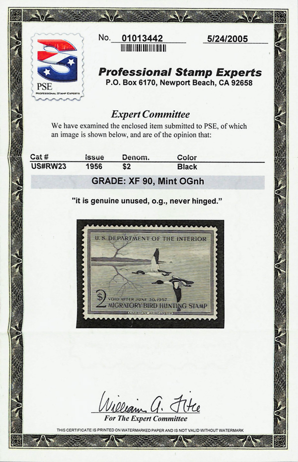 9339 nh RW23 imageFederal Duck Stamp, 1956, $2 American Merganser (Scott RW23), o.g., never hinged, Extremely Fine, with 2005 P.S.E. certificate graded XF 90.
