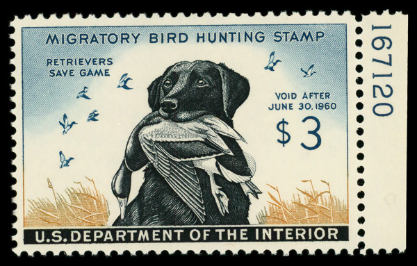 9341 nh RW26 imageFederal Duck Stamp, 1959, $3 Labrador Retriever (Scott RW26), plate number single, o.g., never hinged, Very Fine to Extremely Fine.
