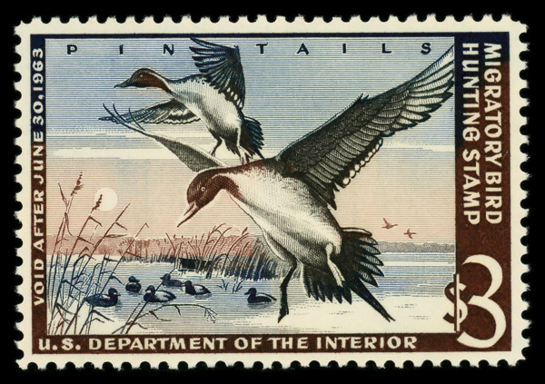 9344 nh RW29 imageFederal Duck Stamp, 1962, $3 Pintail Drakes (Scott RW29), o.g., never hinged, Extremely Fine.