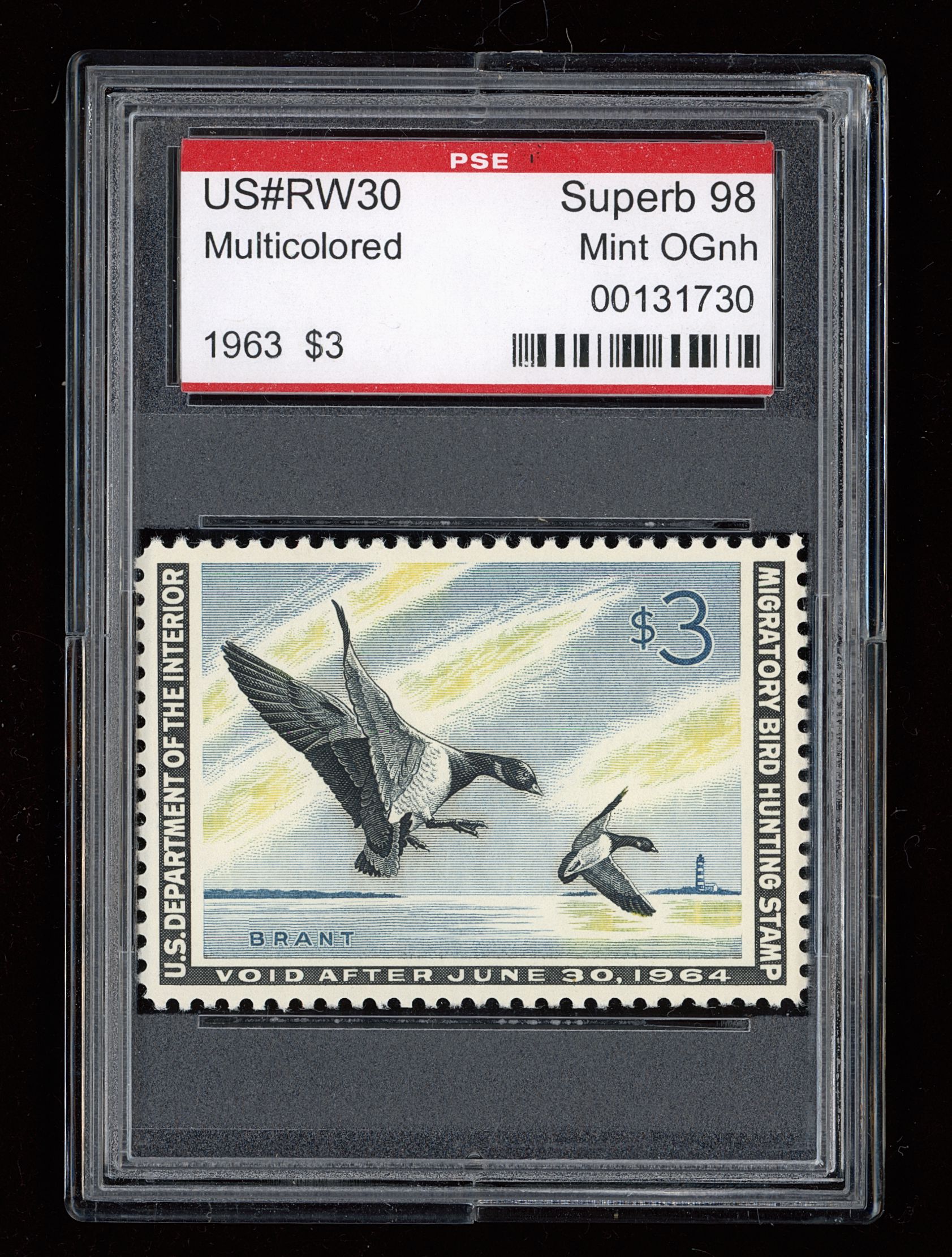9345 nh RW30 imageFederal Duck Stamp, 1963, $3 Brants (Scott RW30), o.g., never hinged, Superb, with P.S.E. encapsulated certificate graded XF-SUP 95.