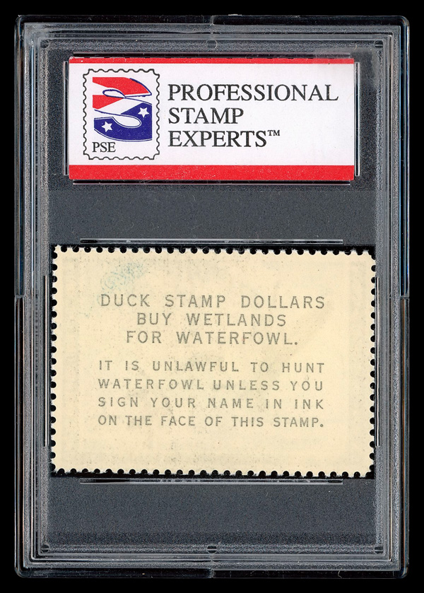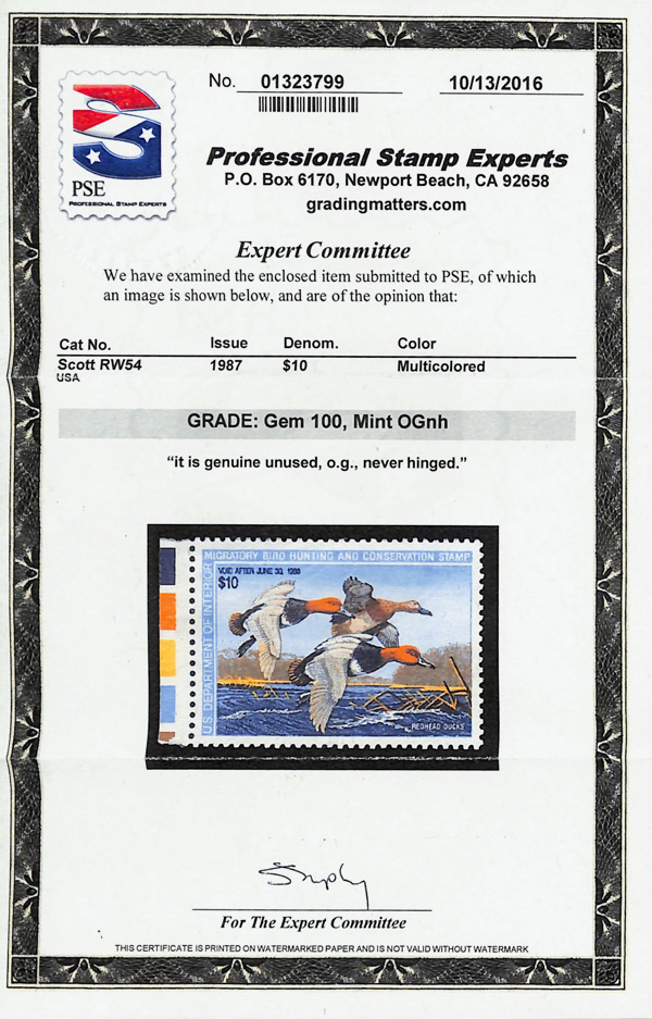 9356 nh RW54 imageFederal Duck Stamp, 1987, $10 Redhead Ducks (Scott RW54), o.g., never hinged, Superb, with 2016 P.S.E. certificate graded GEM 100.