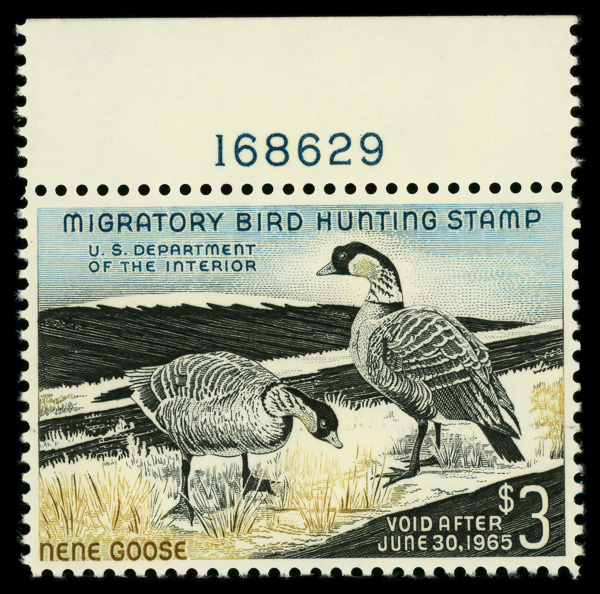 9347 nh RW31 imageFederal Duck Stamp, 1964, $3 Nene Geese (Scott RW31), plate number single, o.g., never hinged, Very Fine to Extremely Fine.