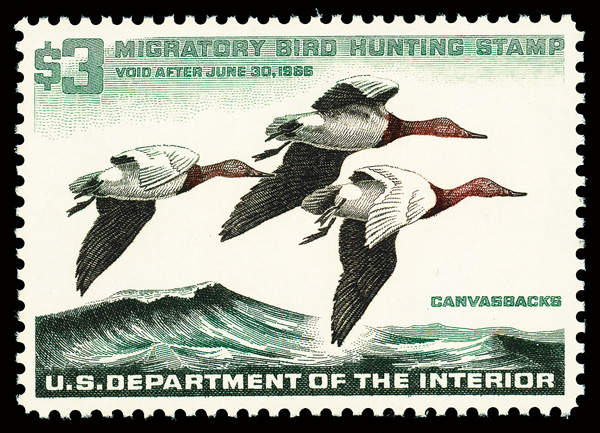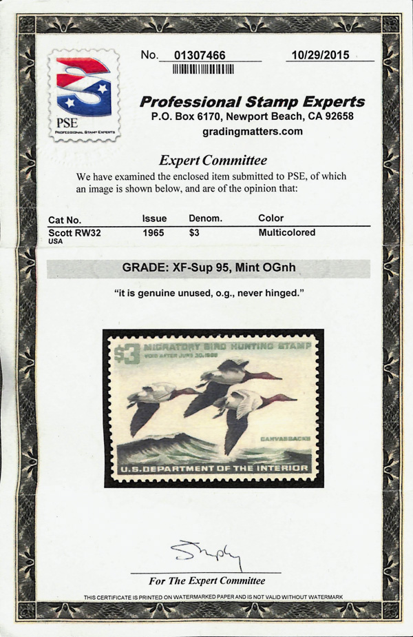 9349 nh RW32 imageFederal Duck Stamp, 1965, $3 Canvasback Drakes (Scott RW32), o.g., never hinged, Extremely Fine to Superb, with 2015 P.S.E. certificate graded XF-SUP 95.
