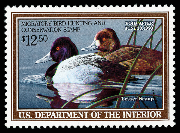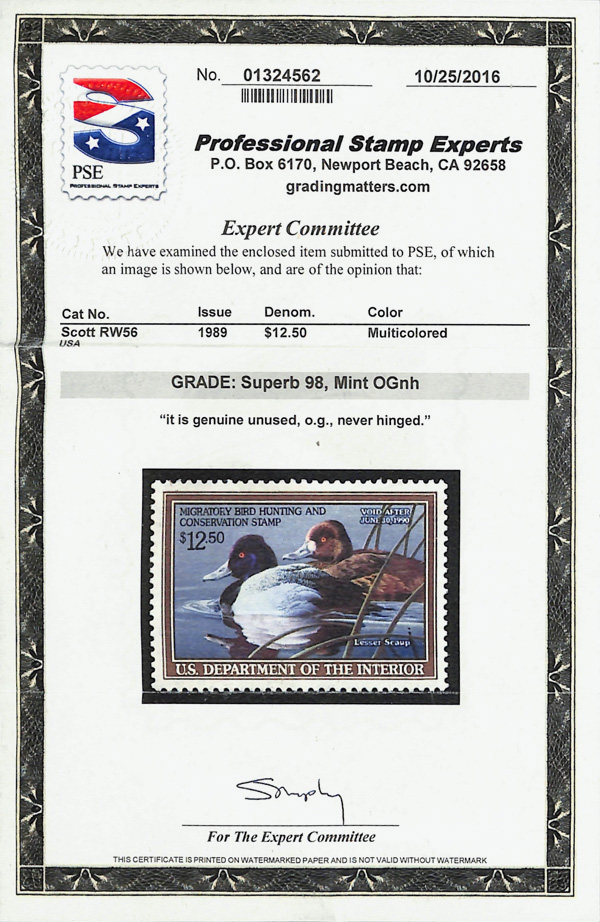 9358 nh RW56 imageFederal Duck Stamp, 1989, $12.50 Lesser Scaup (Scott RW56), o.g., never hinged, Superb, with 2016 P.S.E. certificate graded SUP 98.