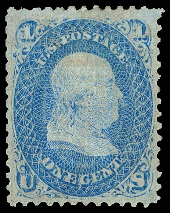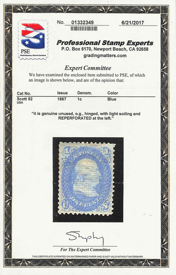 5033 og 92 image1867, 1¢ blue, F. grill (Scott 92), large part o.g.; reperfed at left, Very Fine, with 2017 P.S.E. certificate.