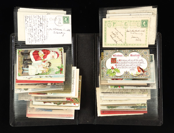 5009   imageUnited States, Christmas postcards 1901-1916, about 50 turn of the century mostly used picture postcards concerning Christmas in a White Ace cover binder; three are postmarked December 25th; would make a terrific exhibit. Shipping charges apply - weight 3.2 lbs. (Video for this lot) (Image) Suggested Bid $200
