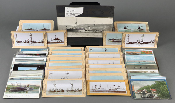 5007   imageUnited States, Naval stereographs and postcards 1904-1940, 55 turn of the century stereographic cards (many colorized) showing mostly US warships including several illustrating the wreckage of the USS Maine; stunning 1906 Belgian battleship (Le Pelayo) folded postcard (postally used); plus about 50 postcards, most pre-1920 and postally used; quality lot, Fine to Very Fine. Shipping charges apply - weight 3.8 lbs. (PDF for this Lot) (PDF3 for this Lot) (Image) (Image2) (Image3) (All Images)