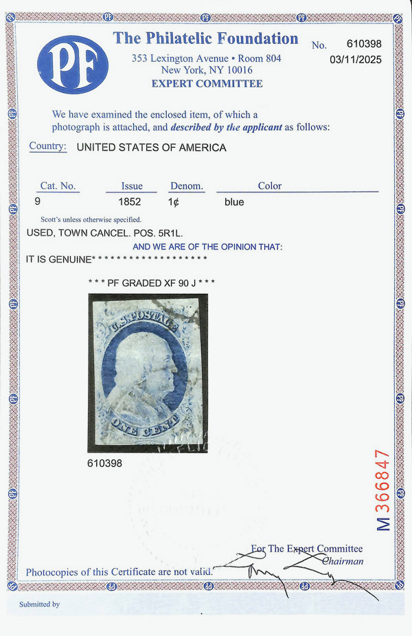 5018 O 9 image1852, 1¢ blue, type IV (Scott 9), position 5R1L, town cancel, Extremely Fine, with 2025 P.F. certificate graded XF 90J.