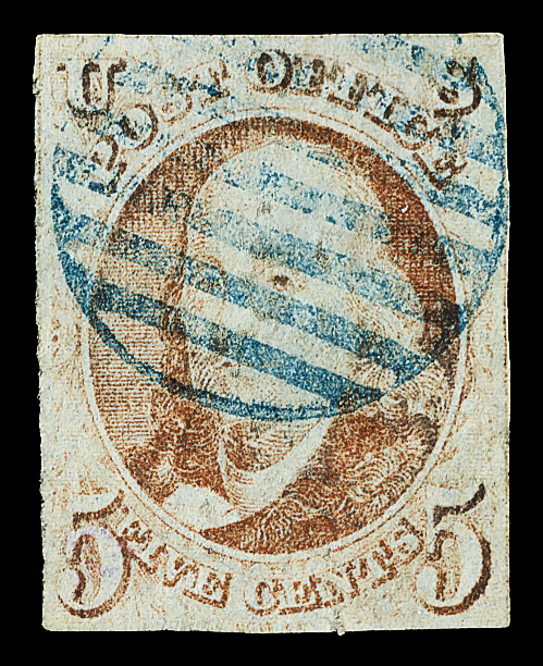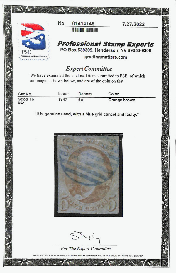 5014 O 1b image1847, 5¢ orange brown (Scott 1b), single, With blue grid cancel and small paper scuff in bottom margin below the "N" of cents., Fine, with 2022 P.S.E. certificate.