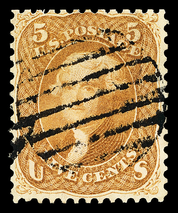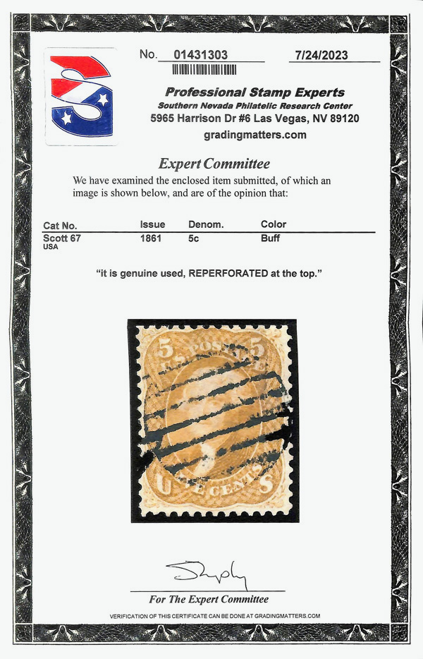 5026 O 67 image1861, 5¢ buff (Scott 67), single, Black grid cancel; Reperforated at top., Fine, with 2023 P.S.E. certificate.