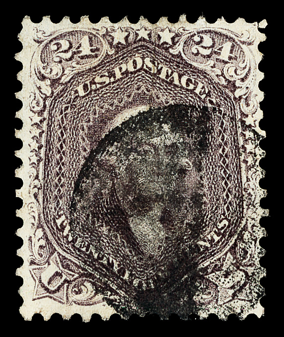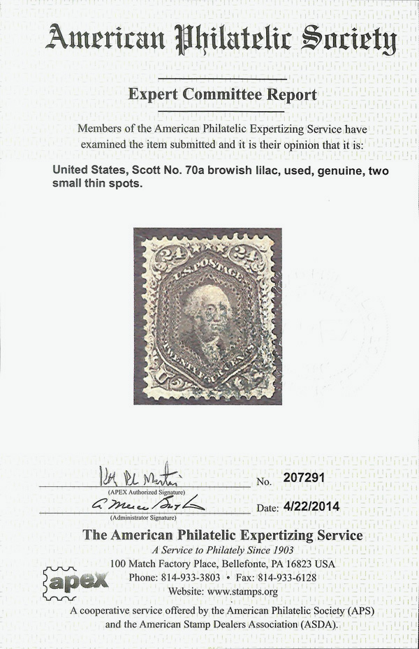 5027 O 70a image1862, 24¢ brown lilac (Scott 70a), vibrant color and 4 clear margins for this example of this issue; two small thin spots, Fine to Very Fine, with 2014 A.P.E.X. certificate.