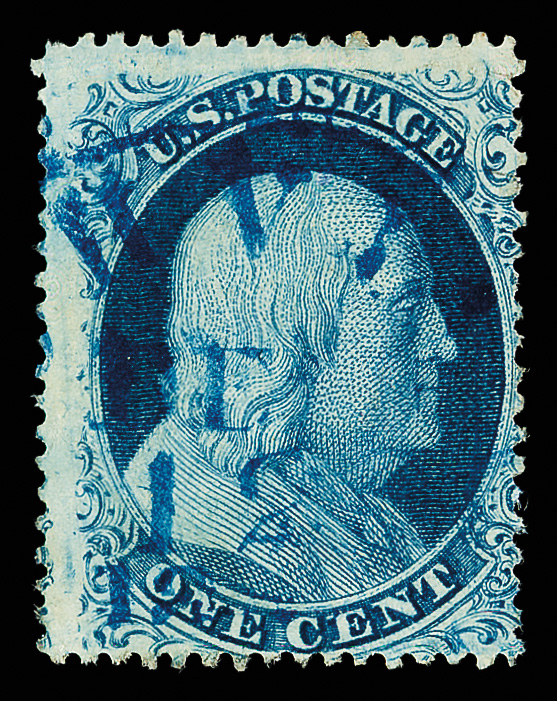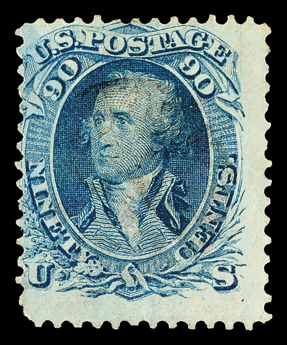 5024 O 39 image1860, 90¢ blue (Scott 39), nicely centered with intense color and two partial town postmarks; closed tear at bottom right, top right corner added with portions of design drawn in, mostly reperforated, Fine to Very Fine appearance, with 1992 P.F. certificate.