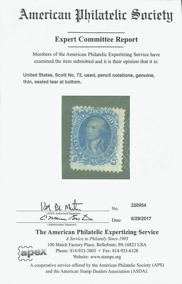 5029 O 72 image1861, 90¢ blue (Scott 72), single; Center thin and sealed tear at bottom., Fine, with 2017 A.P.E.X. certificate.