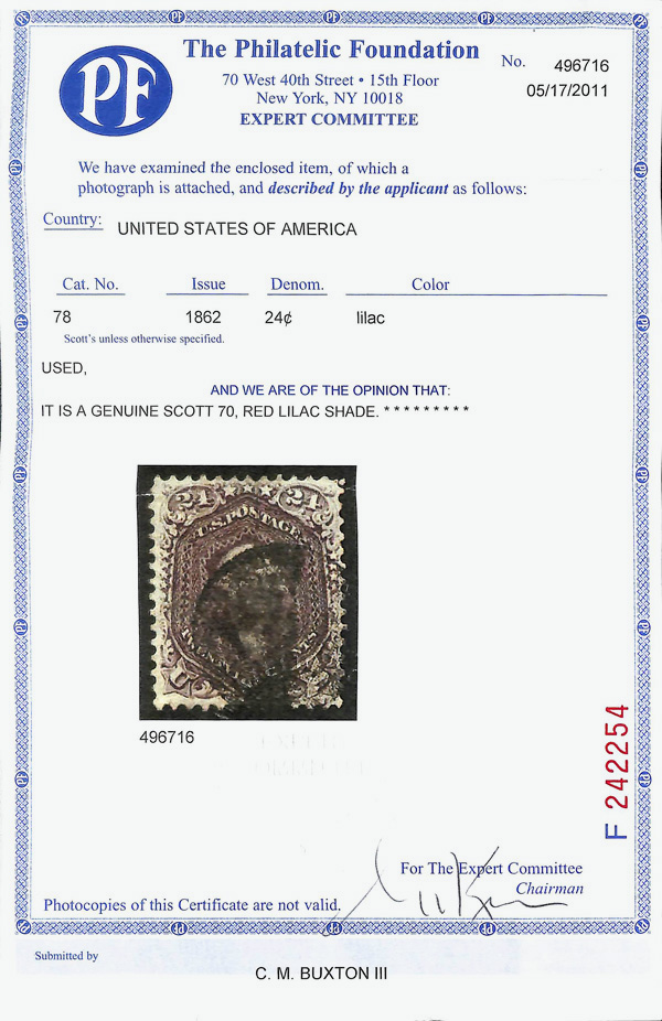 5031 og 78 image1863, 24¢ lilac (Scott 78), single, Fine to Very Fine, with 2011 P.F. certificate.