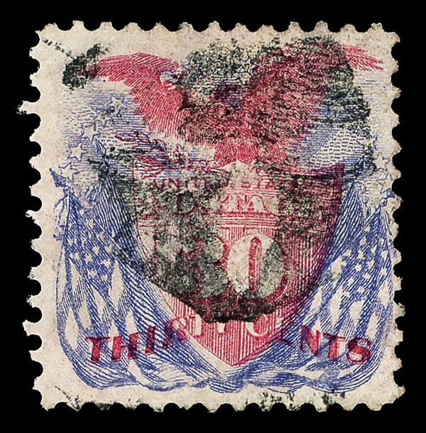 5038 O 121 image1869, 30¢ ultramarine & carmine (Scott 121), fresh and sound with all perforations present and complete, with inviting colors and solid centering; black cork and red transit cancels, Fine to Very Fine, with 2003 P.S.E. certificate.