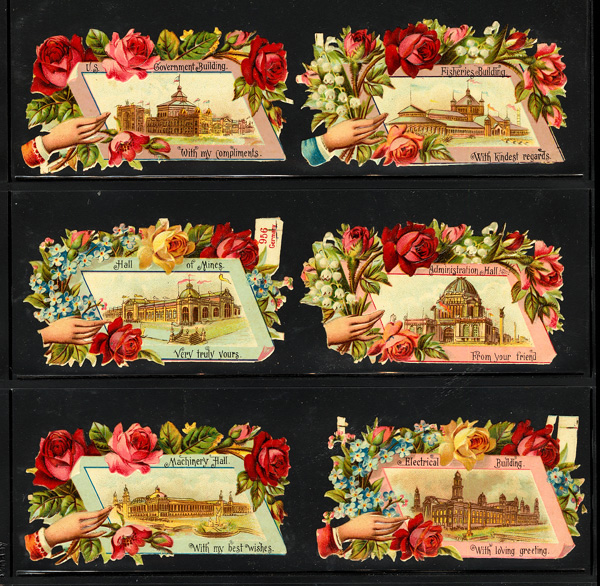 5002 1893 columbian exposition ladies greetin imageAssortment of 1893 Columbian Exposition Ladies Greeting Die Cuts, features one uncut set and one cut set; both are in very nice condition, with beautiful colors and details. (Image) (Image2) (All Images)