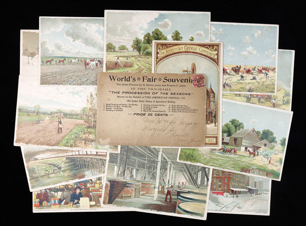 5005 1893 columbian exposition american cerea image1893 Columbian Exposition the American Cereal Company Cards with Original Cover, features 12 different cards; features some advertising for Quaker Oats and others; cards in very good to fine condition, cover is cut; a very scarce piece. (PDF for this Lot) (Image) Suggested Bid $80