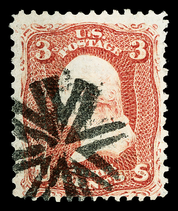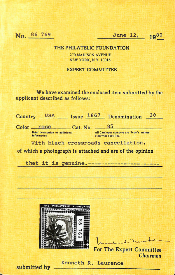 5032 O 85 image1867, 3¢ rose, D. grill (Scott 85), unusually deep color on bright paper, with solid detail and circle-of-Vs cancel ("black crossroads cancel" per certificate), Fine+, with 1980 P.F. certificate.