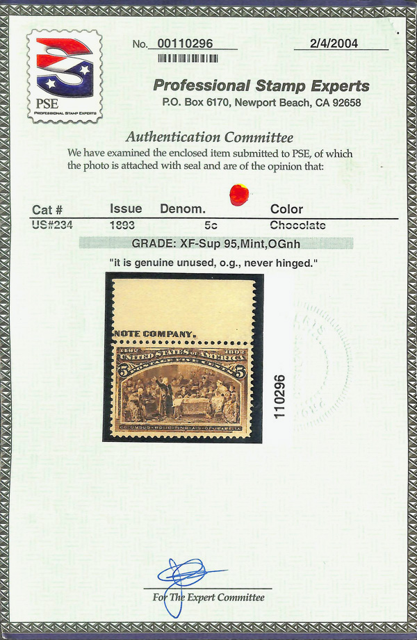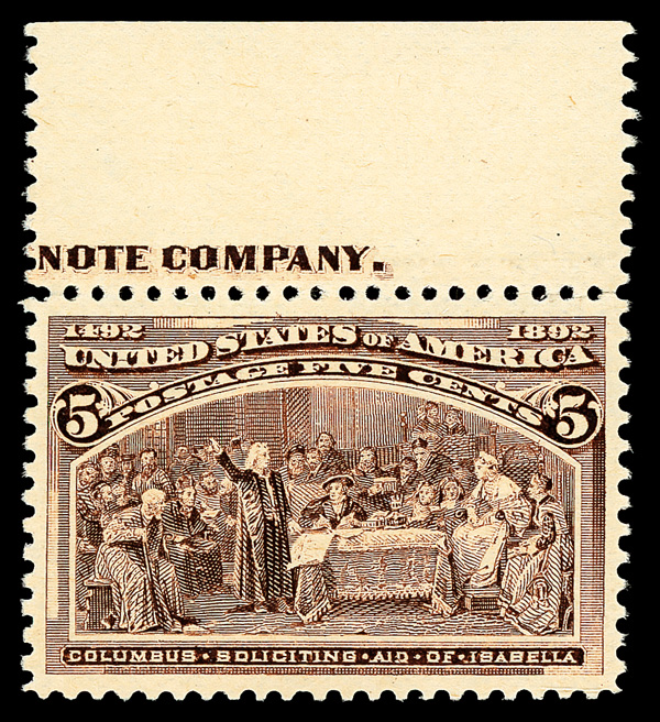 5039 nh 234 image1893, 5¢ Columbian (Scott 234), full top margin part imprint single, o.g., never hinged, pretty positional with razor-sharp detail in captivatingly clear color, fresh with exceptional centering, Extremely Fine to Superb, with 2004 P.S.E. and 2018 P.S.A.G. certificates, each graded XF-SUP 95.