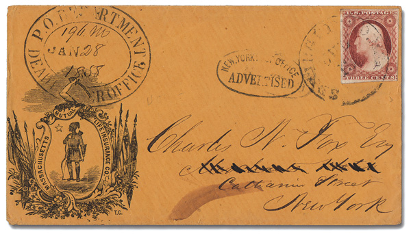5019 cover 11 image1852, 3¢ dull red, type I (Scott 11), nearly four margins, tied by a light Springfield, Ill. c.d.s., Jul 13 (1857), on a clean buff illustrated advertising cover for the Massachusetts Mutual Life Insurance Co. to New York City; handstamped small oval "New York Post Office/Advertised" and a large double oval, "P.O. Department/Dead Letter Office" dated Jan 28, 1858, Very Fine. A lovely, late use of the 3¢ imperf. (Image) (Image2) (All Images)
