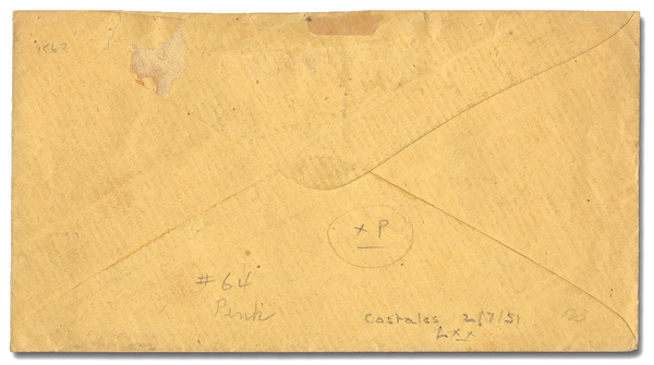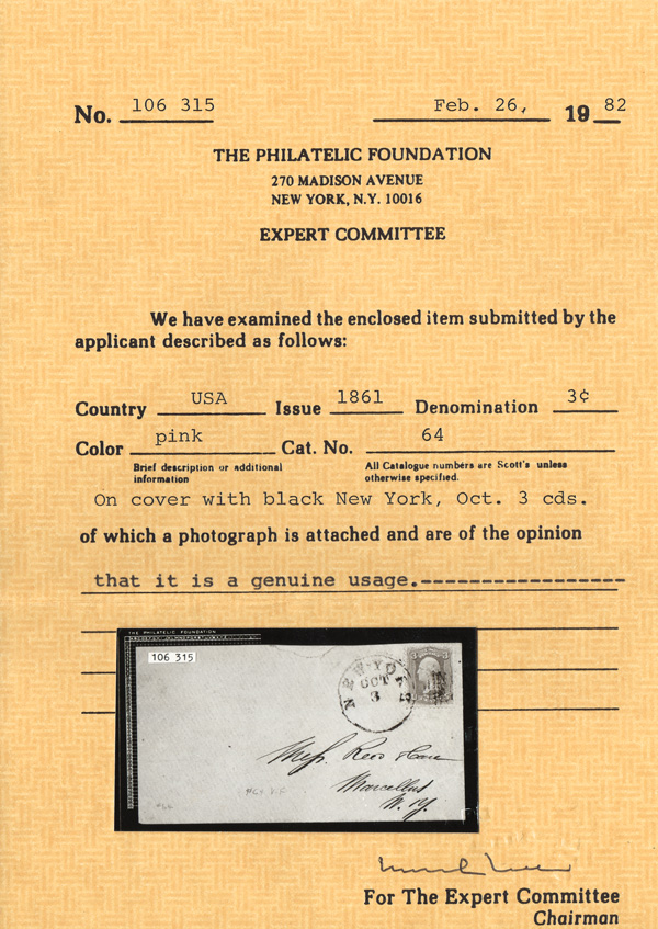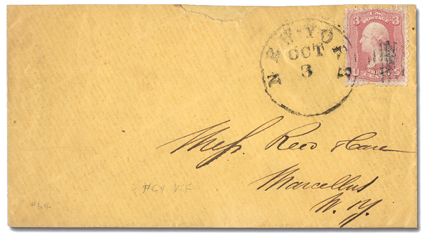 5025 cover 64 image1861, 3¢ pink (Scott 64), fresh and nicely centered tied by an Oct 4 New-York duplex on a buff cover to Marcellus, N.Y.; small piece of cover front missing at the top, otherwise Very Fine, with a 1982 P.F. certificate.