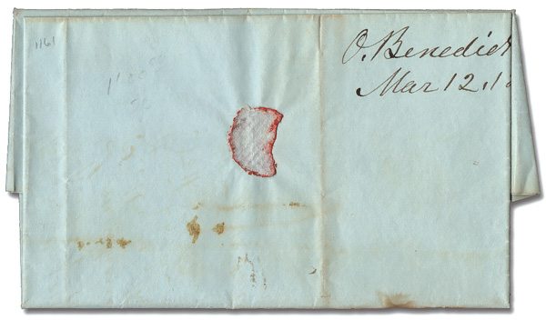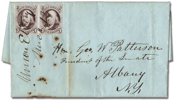 5012 cover 1 image1847, 5¢ brown (Scott 1 var.), tied by manuscript "Union Ellery, March 12" (1849) on a folded letter to Albany, N.Y.;; in the letter, to Geo. W. Patterson, "President of the Senate," the writer, Dr. Odin Benedict, asks that he be appointed Postmaster of Union Ellery [later West Ellery, then just Ellery] because, "our Loco Poko P.M. has privately resigned and procured the appropriate of Wm Bacon…and I wish to prevent it." the pair has a full margin at the top and parts at the left & bottom, the cover has some foxing, but the letter is clear and easily read. A most interesting piece of Chautauqua County, N.Y. Postal History.