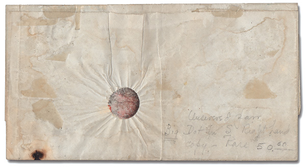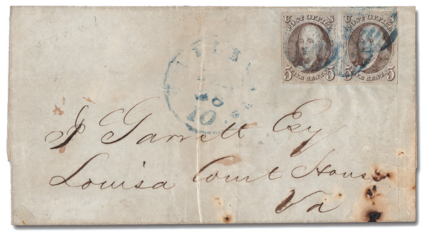 5013 cover 1 image1847, 5¢ brown, dot in "S" variety (Scott 1 var.), the right stamp in a horizontal pair, small top & bottom margins, just to frame line at the sides, tied by blue grids on a folded cover from Philadelphia to Louisa Court House, Va. with a weak blue "Philada. Pa./10" c.d.s.; some ink erosion at the lower right, Fine.
