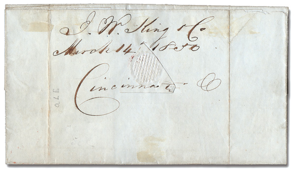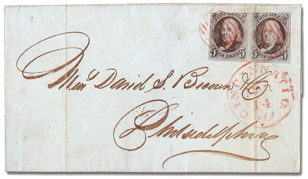 5015 cover 1 var image1847, 5¢ brown (Scott 1 var.), horizontal pair, cut in at the top, tied by a neat red grids on a folded cover from Cincinnati. to Philadelphia with a light red "Cincinnati, O./10," cds, Mar 10 (1850); one of two vertical file folds passes through the right stamp; otherwise clean Very Fine.