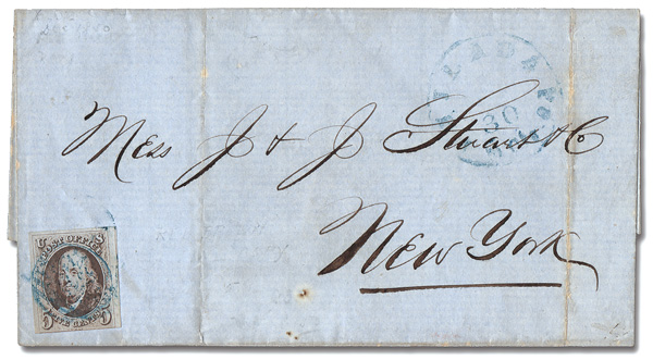 5017 cover 1 var. image1847, 5¢ brown (Scott 1 var.), three large margins, barely touching at the bottom, tied by blue grid on a folded cover from Philadelphia to New York with a light blue "Philada. Pa./5 cts.," c.d.s. (Dec) 30" (1850), Fine to Very Fine.