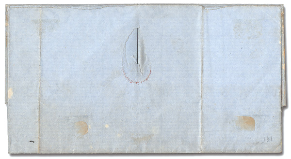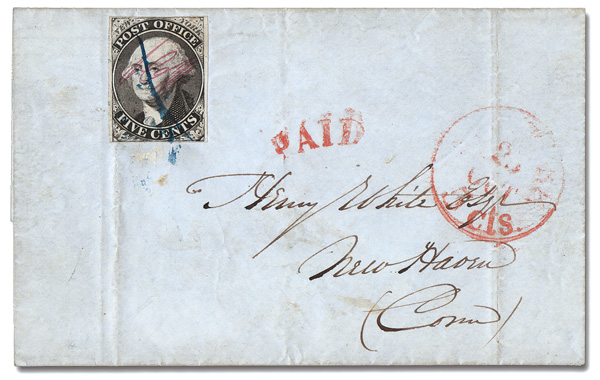 5011 cover 9X1 imageNew York, N.Y., 1846, 5¢ black on bluish, signed "ACM" connected (Scott 9X1), nice side margins, close or just touching top & bottom. tied by a blue pen stroke on a folded cover to New Haven, Ct., with red "PAID" and partial "(New-York)/ 5 cts./ 25 Oct" c.d.s., Fine.