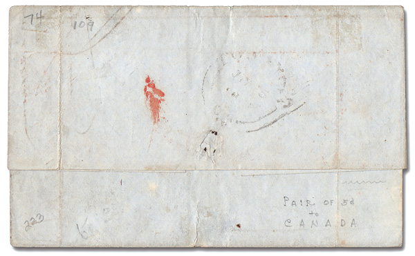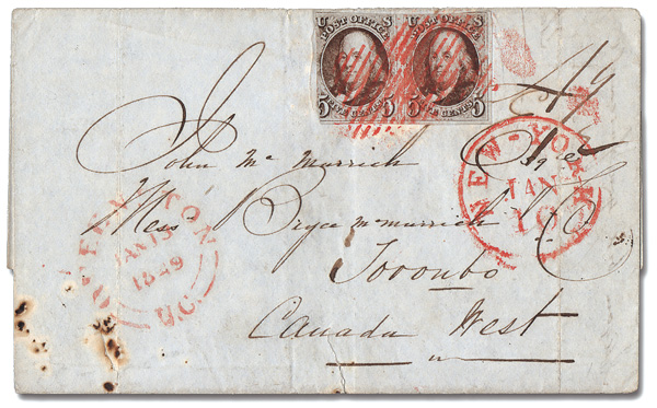 5016 cover 1 var. image1847, 5¢ dark brown (Scott 1 var.), horizontal pair, two good margins, in at top & left; tied by red grids on a folded cover to Toronto, Canada with red "New-York, Jan 10" and "Queenston, U.C., Jan 13, 1849" c.d.s.s; small tear at the bottom, Fine.