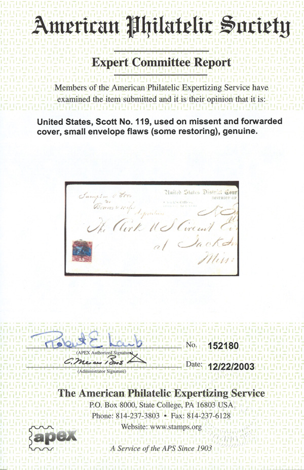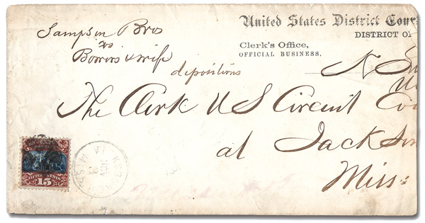 5035 cover 119 image1869, 15¢ brown & blue, type II (Scott 119), a fresh, F-VF example tied by a quartered cork cancel beside a light Vicksburg, Miss. c.d.s.; used to pay forwarding postage on a reduced lsixe Official Business cover to Jackson, Miss., but apparently missent to Vicksburg; some flaws and restoration, Fine, with a 2003 A.P.E.X. certificate.