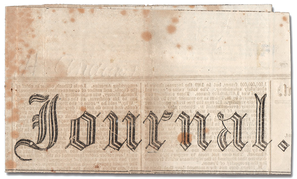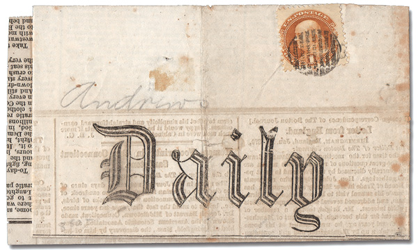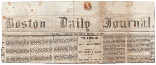 5034 ogcover 112 image1869, 1¢ buff (Scott 112), tied by a neat grid on a newspaper masthead of the Boston Daily Journal, March 1, 1870; about 15" x 6" and including the tops of six columns worth of news of the day, included "The Rate of Wages of Farm Laborers in to the United State" and "Democratic Demoralization in New Hampshire", Fine to Very Fine, only 346 sold. (Image) (Image2) (Image3) (All Images)