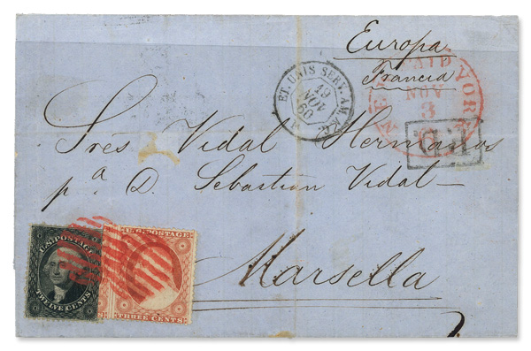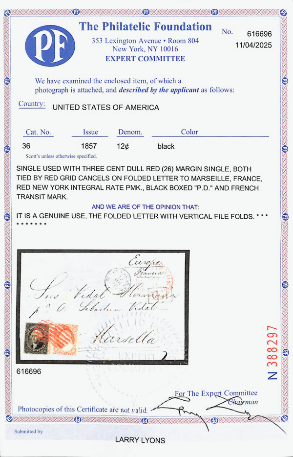 5023 cover 36 image1857, 12¢ black, plate I (Scott 36), with 3¢ dull red (26) left margin single, both tied by red grid cancels on folded letter to Marseille, France, red New York integral rate postmark, black boxed 'P.D.' and French transit mark. Letter with file folds., Very Fine, with 2025 P.F. certificate.