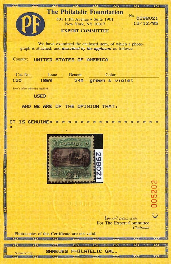 5036 O 120 image1869, 24¢ green & violet (Scott 120), fresh with colors in near-perfect registration, bright and unobtrusively cancelled, nearly Very Fine, with 1995 P.F. certificate.