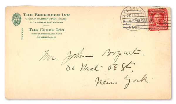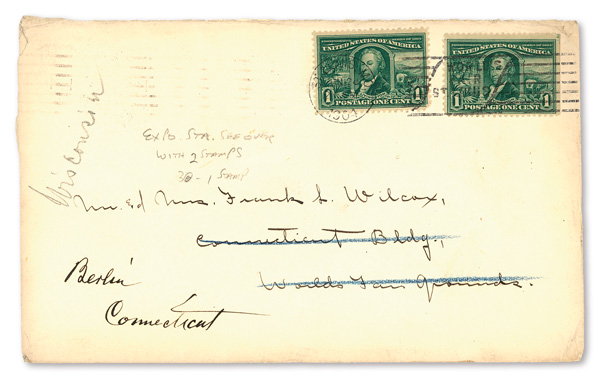 5393 cover 319 image1905, 2¢ carmine on Cover with St. Louis Exposition Cancellation Error (Scott 319), cancelled October 27, 1905; letter postmarked with partial Exposition cancellation; it is unclear if it was a favor cancellation or if someone received a machine die; this piece is a tremendous oddity; postmarked from Greater Barrington, Mass. and addressed to New York, New York; an intriguing cancellation. (Image) Suggested Bid $240