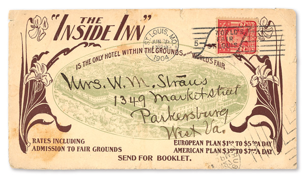 5394 cover 319 image1904, 2¢ carmine on Advertising Cover with Exposition Station Cancel (Scott 319), cancelled June 26, 1904; a very unique cover advertising the Inside Inn, the only hotel permitted to be operated on Exposition grounds; addressed to Parkersburg, West Virginia; features some staining and various hinges on the back to repair tears. (Image) Suggested Bid $320