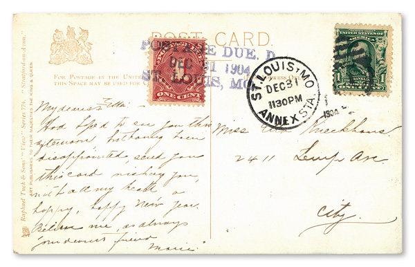 5391 cover 300 image1904, 1¢ blue green on Postcard with St. Louis Annex Station Postal Cancel (Scott 300, J38), cancelled December 31, 1904; a difficult piece to find due to the Exposition being closed to the public by this time; it is believed that the six known "ANNEX" cancellations were used during the construction and operation of the Exposition as an adjunct for the Post Office due to the large volume of mailings; various Postal Stations were setup in different buildings; there are some Annex cancels during the period of the demolition of the Exposition grounds or closing, such as this; in good condition. (Image) Suggested Bid $400