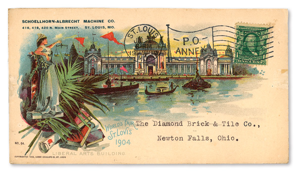 5392 cover 300 image1904, 1¢ blue green on Souvenir Cover with Annex Station Postmark (Scott 300), cancelled July 2, 1904; features a beautiful image of the Liberal Arts Building with magnificent colors; produced by Hesse Envelope Co. of St. Louis; addressed to Newton Falls, Ohio; a very attractive piece. (Image) Suggested Bid $240
