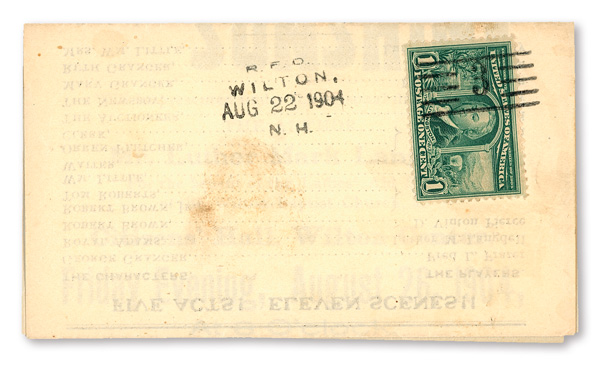5395 cover 323 image1904, 1¢ Louisiana Purchase on Free Rural Delivery (R.F.D.) Unsealed Flyer (Scott 323), cancelled August 22, 1904; from Wilton, New Hampshire with R.F.D. cancel; a unique and scarce philatelic piece. (Image) Suggested Bid $120