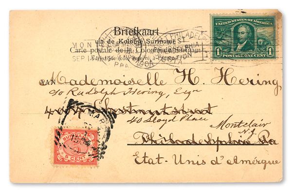5397 cover 323 image1904, 1¢ Louisiana Purchase on Mixed Franking Suriname Domestically Forwarded Postcard (Scott 323), postmarked from Suriname on August 8, 1904; forwarded to Montclair, New Jersey from Philadelphia, Pennsylvania; arrived in Montclair on September 17th; an attractive and unique postcard. (Image) Suggested Bid $160