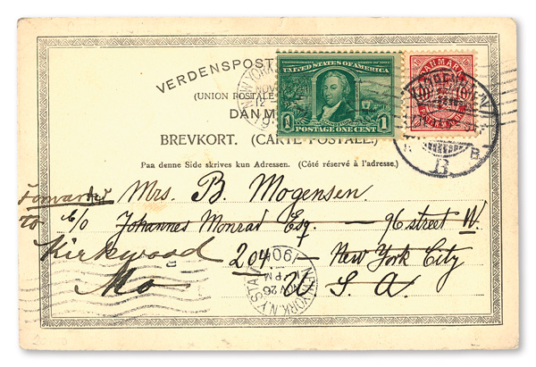 5398 cover 323 image1904, 1¢ Louisiana Purchase on on Mixed Franking Denmark Domestically Forwarded Postcard (Scott 323), postmarked from Denmark (with 10 Ore issue) on postcard to New York, New York for forwarding to Kirkwood, Missouri; left November 16, 1904 and arrived on the 30th in Missouri. (Image) Suggested Bid $160