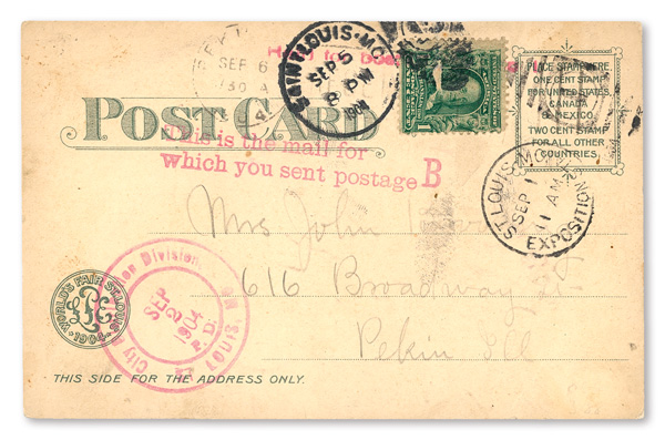 5390 cover 300 image1904, St. Louis Exposition Souvenir Postcard with Exposition Cancel and "HELD FOR POSTAGE" Note (Scott 300), an extremely rare piece; no postage on card when mailed but with Exposition Cancel, September 1, 1904; souvenir card features an image by S. Cupples Co. of the Palace of Agriculture; item features some wear and light staining. (Image) Suggested Bid $600