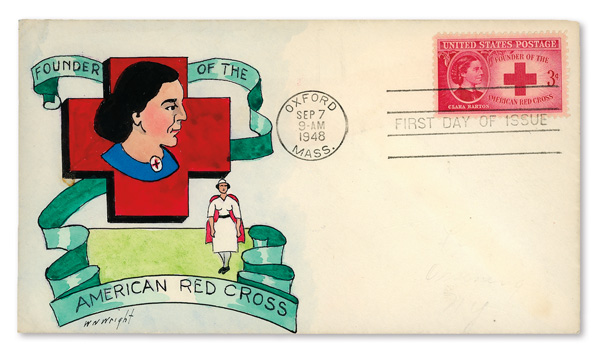 5386 cover 967 image1948, 3¢ Clara Barton (Scott 967), unaddressed cover with W.N. Wright multicolor hand-painted cachet and Oxford, Mass. Sept. 7, 1948 First Day Cover cancel, nearly Very Fine. (Image) Suggested Bid $200
