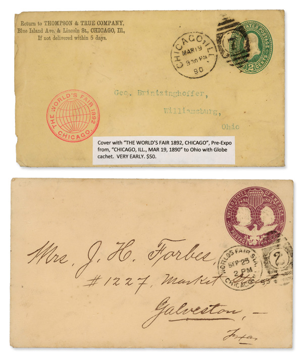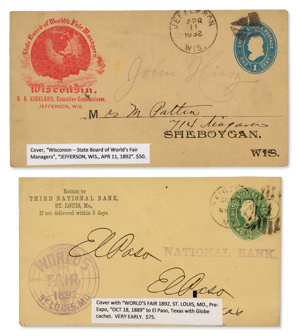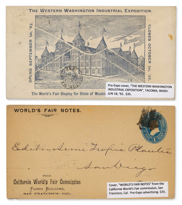 5387 og   image1890's American Expositions Covers, 14 including George W. Linn with beautiful image of the Columbian Expo Conservatory, ornate corner card of the "World's Fair Trust-Fund Transportation Co.", ornate corner card of the "office of the Director-General, World's Columbian Exposition", #231 on cover tied by atypical "World's Fair Station Chicago Sep. 23 1893" machine cancel, multicolor "Kentucky Comfort Old Times Gladstone Sour Mash Whiskey" advertising cover, illustrated corner card of the Illinois Woman's Exposition Board, and "Columbian Year at State Fair. Sacramento September 5 to 17, 92" all over design on back, also includes 2 picture postcards with St. Louis 1904 exposition cancels and images, and Nos. 232, 233 & E3 with Chicago World's Fair cancels -- the 3¢ a scarce oval and the others duplexes, Very Fine, see the others online. Shipping charges apply - weight 0.8 lbs. (PDF for this Lot) (Image) Suggested Bid $600