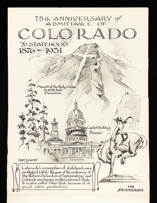 5369 1001 imageDan Lowry, Original Cachet Production Art (1001), 20" x 15" art board with unique pen and ink drawing used by The Aristocrats; very attractive oversized original illustration perfect for framing or as part of an exhibit of the Colorado Statehood 3¢ Issue released in 1951, Very Fine. Shipping charges apply - weight 1 lbs. (Image) Suggested Bid $130