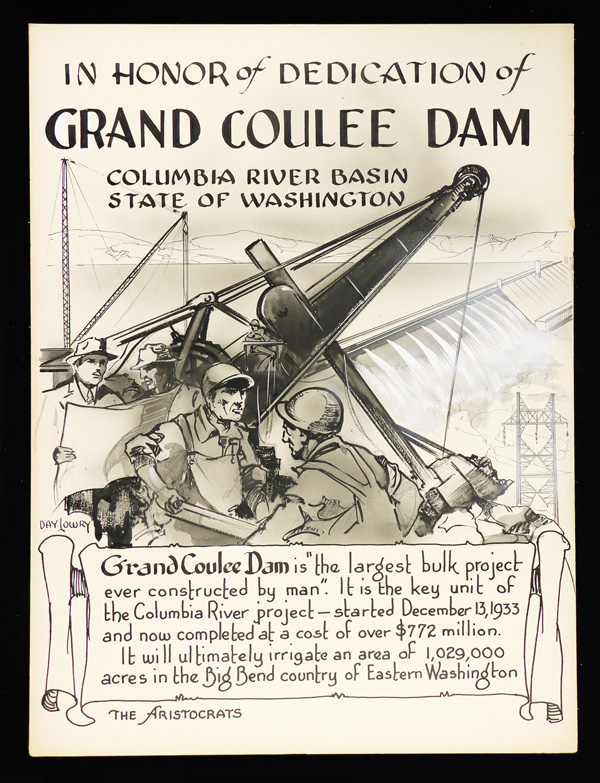 5371 1009 imageDan Lowry, Original Cachet Production Art (1009), 20" x 15" art board with unique pen and ink drawing used by The Aristocrats; very attractive oversized original illustration perfect for framing or as part of an exhibit of the Grand Coulee Dam 3¢ Issue released in 1952, Very Fine. Shipping charges apply - weight 0.8 lbs. (Image) Suggested Bid $130