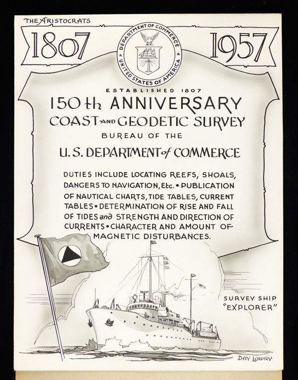 5382 1088 imageDan Lowry, Original Cachet Production Art (1088), 20" x 15" art board with unique pen and ink drawing used by The Aristocrats; very attractive oversized original illustration perfect for framing or as part of an exhibit of the Coast and Geodetic Survey 3¢ Issue released in 1957, Very Fine. Shipping charges apply - weight 0.8 lbs. (Image) Suggested Bid $130