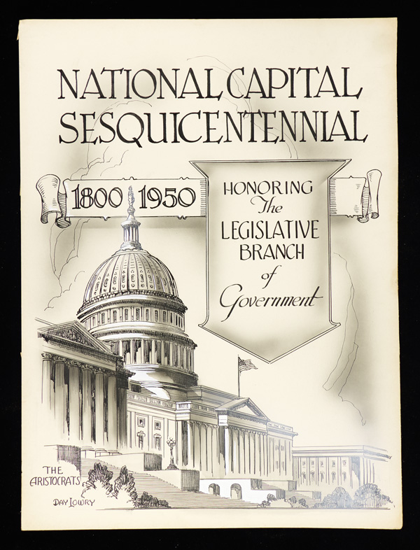 5367 992 imageDan Lowry, Original Cachet Production Art (992), 20" x 15" art board with unique pen and ink drawing used by The Aristocrats; very attractive oversized original illustration perfect for framing or as part of an exhibit of the National Capitol Sesquicentennial (US Capitol) 3¢ Issue released in 1950, Very Fine. Shipping charges apply - weight 1 lbs. (Image) Suggested Bid $130